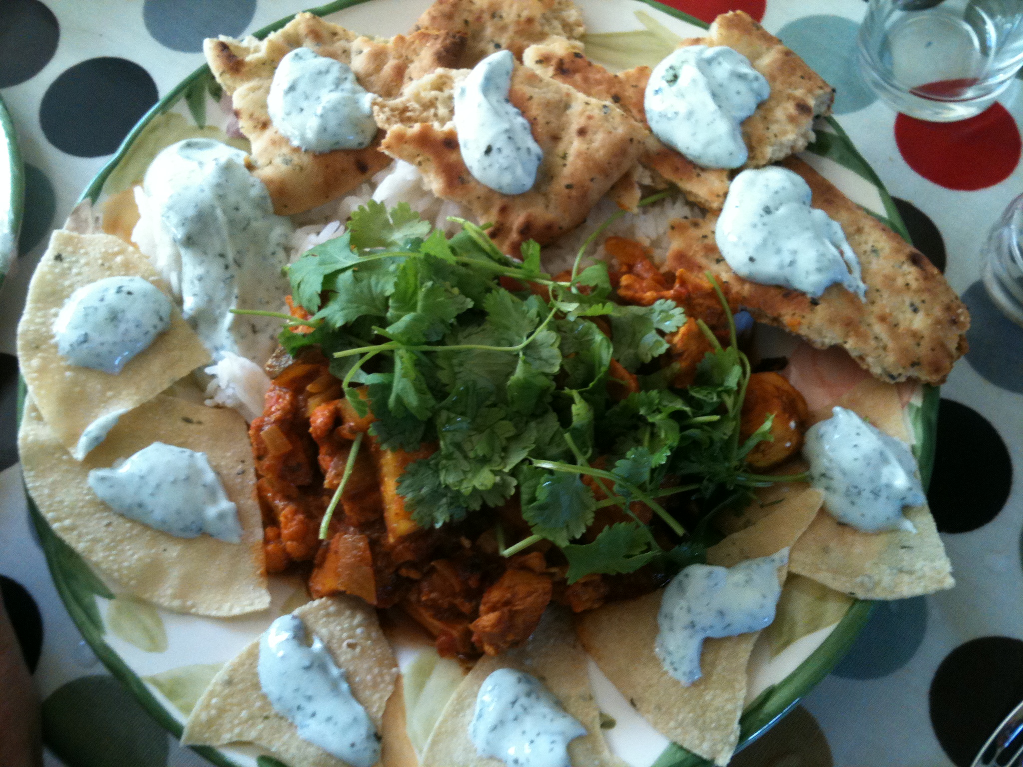 Anyway, after the bee incident, I went for my run and then cooked curry. I’m mildly obsessional about creating a ring of naan and poppodum pieces with a dollop of mint yogurt around the edge of the plate. I then sprinkle chopped raw onion over the yogurt. Yummy! (Picture taken before addition of onion)