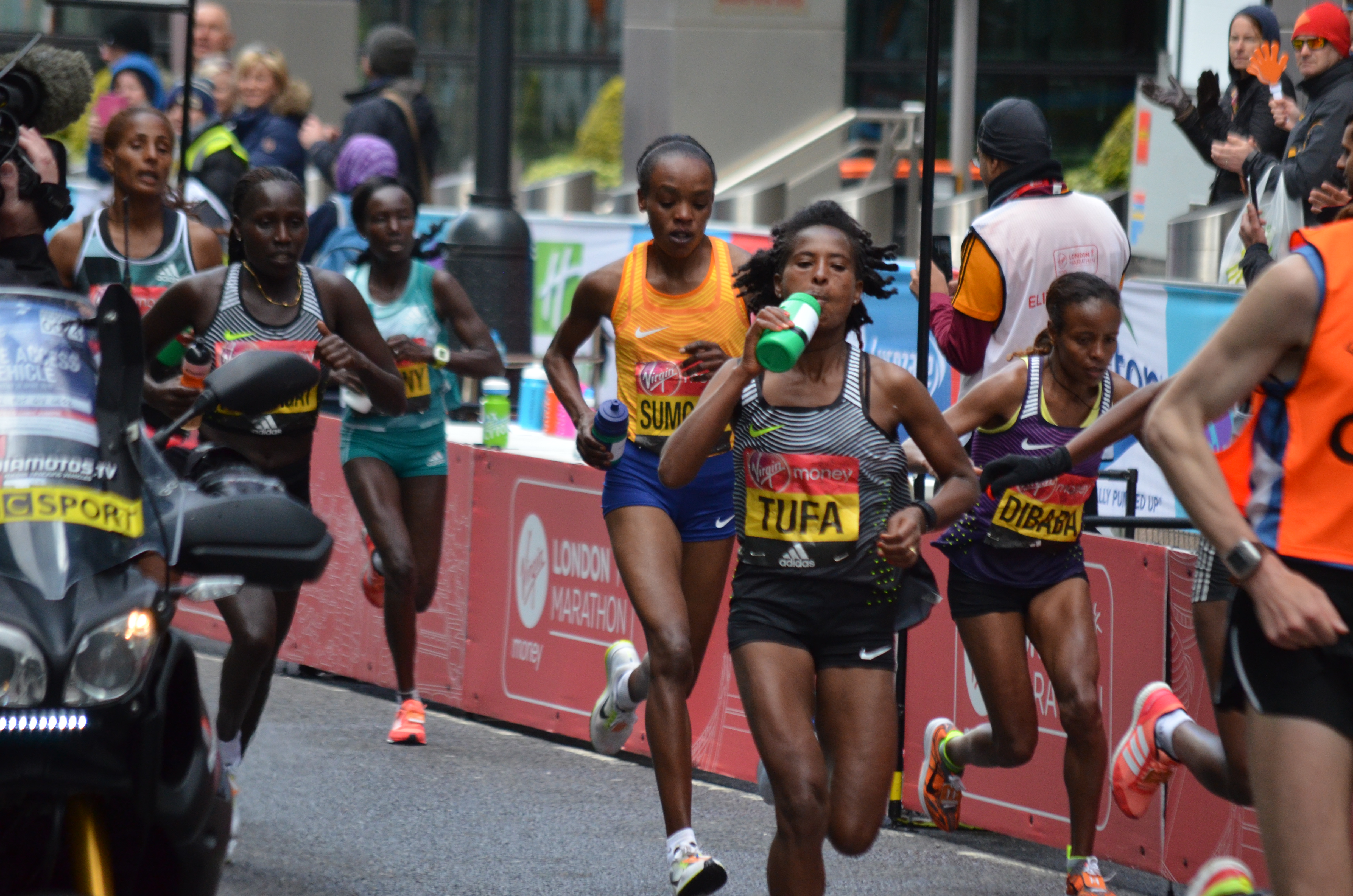 Now the bare facts. We arrived at Canary Wharf around 9am, had coffee in the warmth, saw the wheelchair athletes first, then the runners with physical disabilities (which was humbling) followed by the elite women, elite men, fast club runners and then the mass of runners, many in inventive and spectacular fancy dress. We stayed until the official sweeper car went by around 4pm and immediately behind it were a convoy of clean up vehicles. Threading their way through these hazards, marathoners were still coming through, having been on the start line st 10am and running/walking for 6 hours. They still had 8 miles to complete the course and were obviously struggling. I took 1400 pictures and nearly froze to death. Who is the hero? Me, obviously.